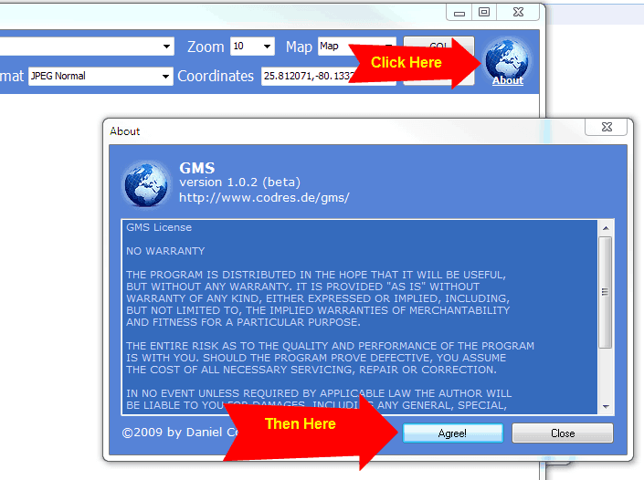 A aplicação possui uma irritante marca d’água, que fica sobre a imagem que se guarda e pode atrapalhar a visualização do mapa, principalmente sobre as localidades centrais. Para removê-la, basta clicar no botão “About” (Sobre), no canto superior esquerdo e seleccionar a opção “I Agree” (Eu concordo) para concluir o registro de utilização e fazer com que esse pequeno incomodo desapareça.